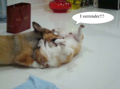 There's Coco jiejie, she's a 9mth old Tri-band corgi. Mommy thot she's my first corgi fren until she found out frm Barnbarn's blog that we met 2 days prior. But she's a real nice corgi jiejie & I like to play with her.